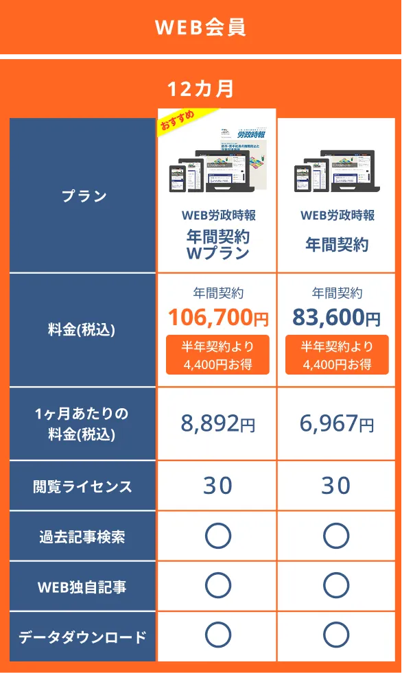 | WEB労政時報 年間契約Wプラン(おすすめ) | 12カ月 | WEB会員 | 106,700円/年間契約(半年契約より4,400円お得) | 8,892円 | 30 |